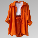 Öleld meg a könnyed eleganciát a Sand Dune Co-ord szettünkkel! A divatorientált nőknek tervezett, texturált, kétrészes szett a kényelmet a laza eleganciával ötvözi. Tartalmaz egy laza szabású, gombos inget elegáns gallérral és állítható mandzsettával, amelyhez tökéletesen illeszkedik a hozzá illő húzózsinóros rövidnadrág a kényelmes, személyre szabott illeszkedés érdekében.