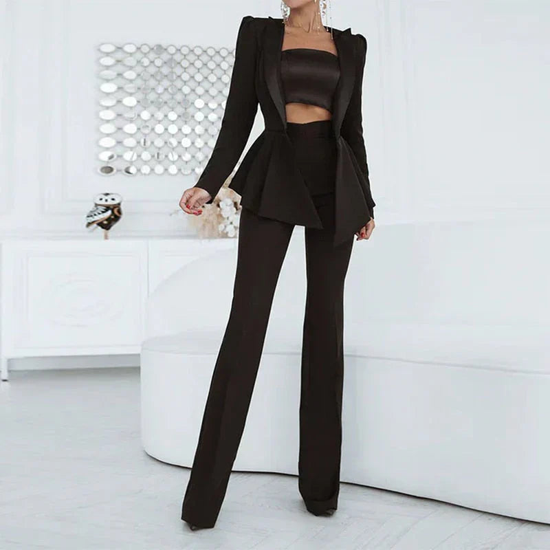 Női blézer szett – karcsúsított szabás – strukturált sziluett – elegáns, bővülő szegély