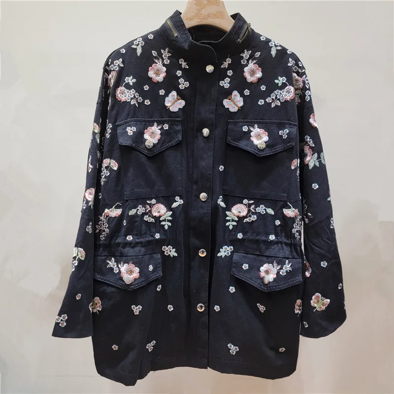 Női ballonkabát – Virágmintás hímzés – Laza szabás – Állógallér – Húzózsinóros derék