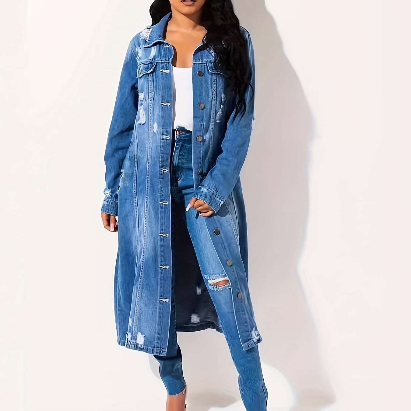 Női hosszú farmerdzseki - szőtt anyagból - laza szabású - klasszikus gallérral