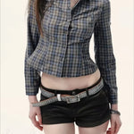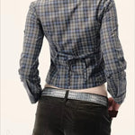Hosszú ujjú, kockás blúz hátul masnival megkötött övvel, testhezálló szabással