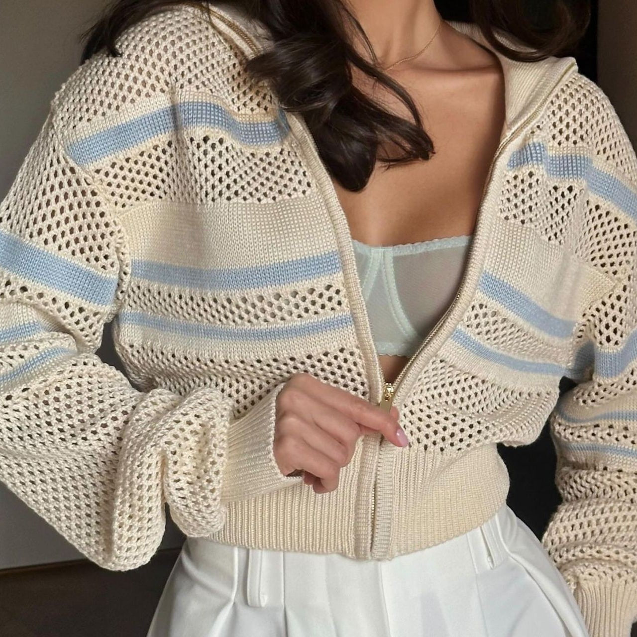 Hosszú ujjú kapucnis pulóver cipzáras nyakkal és kivágásokkal, színes csíkkal