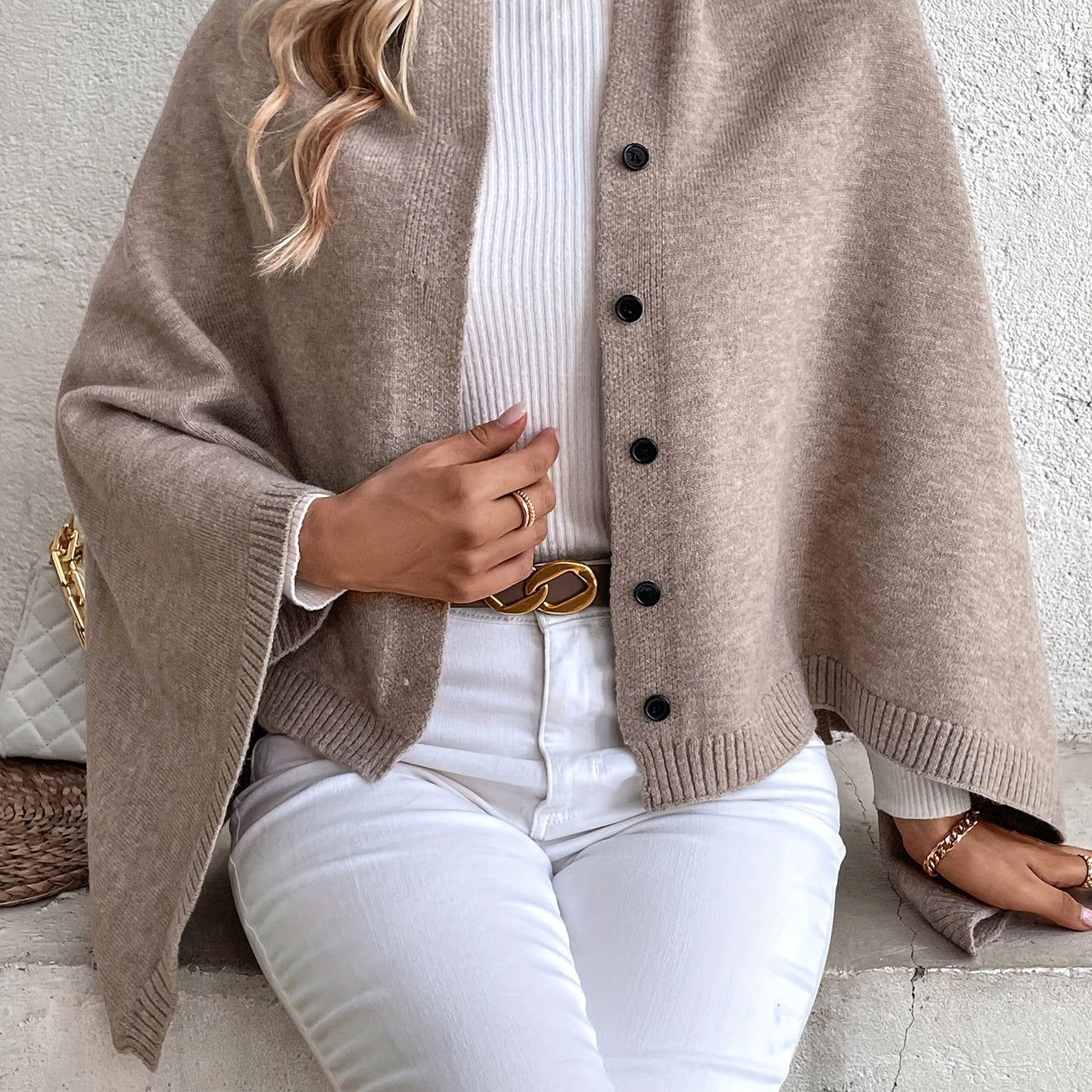 Női poncsó – puha kötésű – laza szabású – gombos záródású – bordázott felülettel