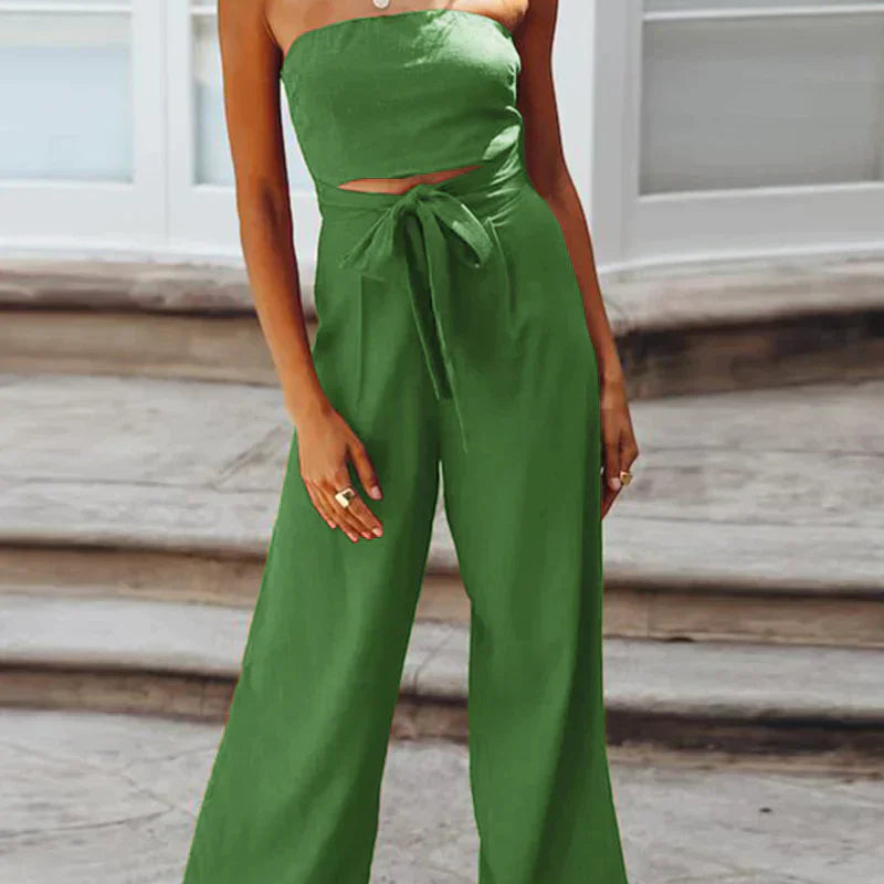 Női pánt nélküli overál – Pamut lenvászon – Széles szárú – Megkötős öv