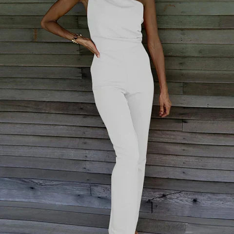Női overál – testhezálló szabású – egy vállú – elegáns egyenes szárú