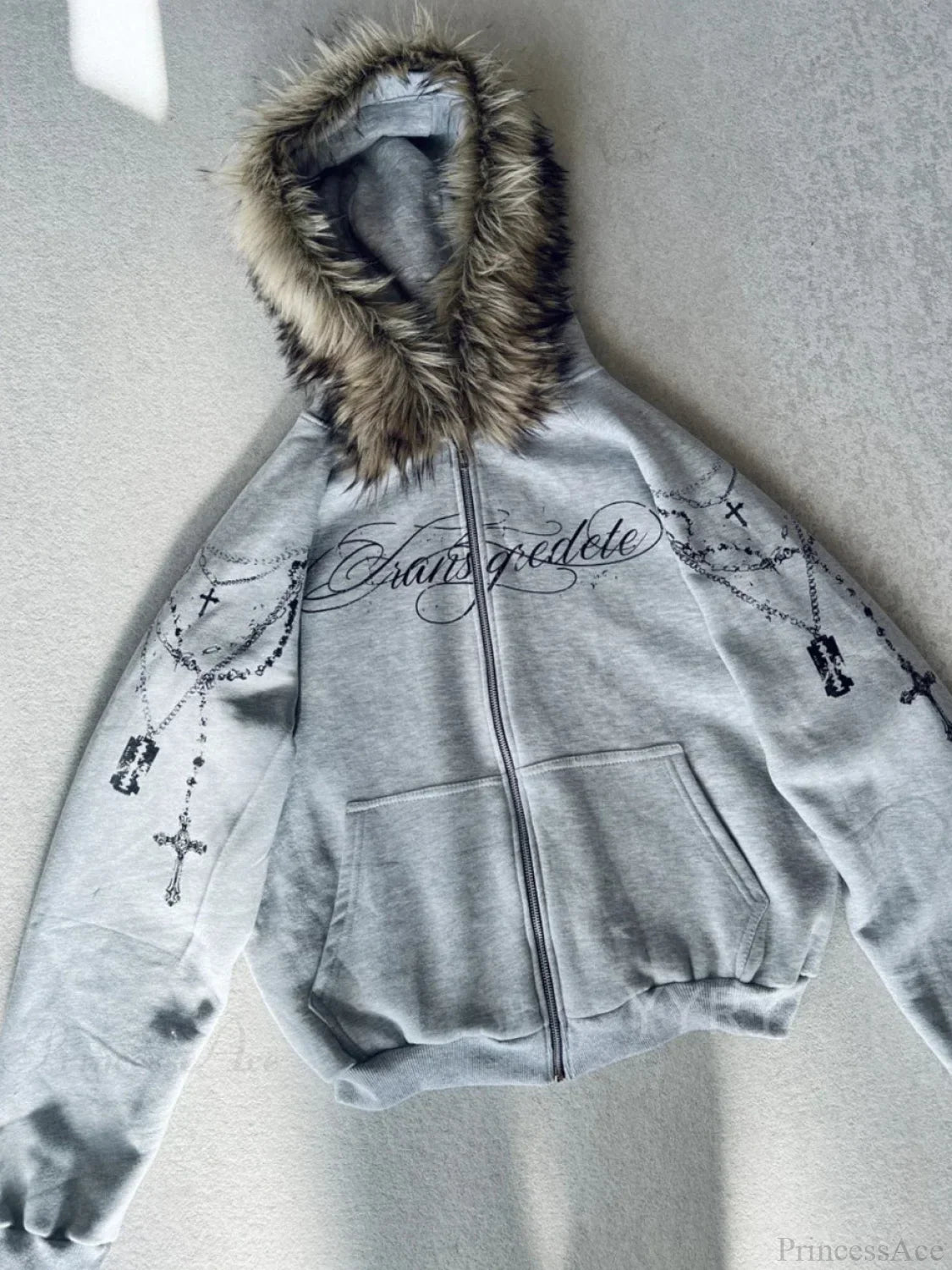 Nyomott mintás kapucnis pulóver cipzárral és levehető szőrmével