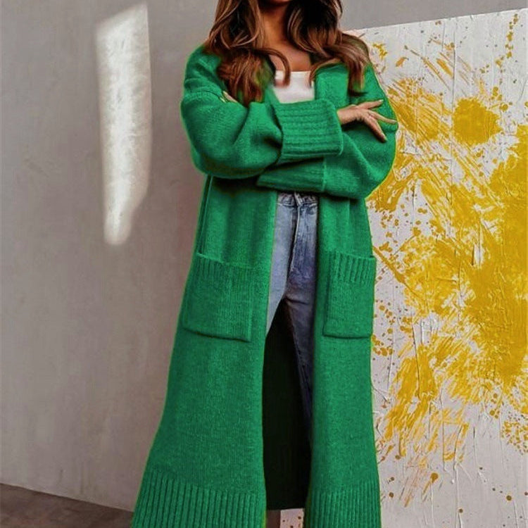Női hosszú kardigán – Túlméretezett fazon – Puha gyapjú – Gomb nélküli nyílás – Elülső zsebek