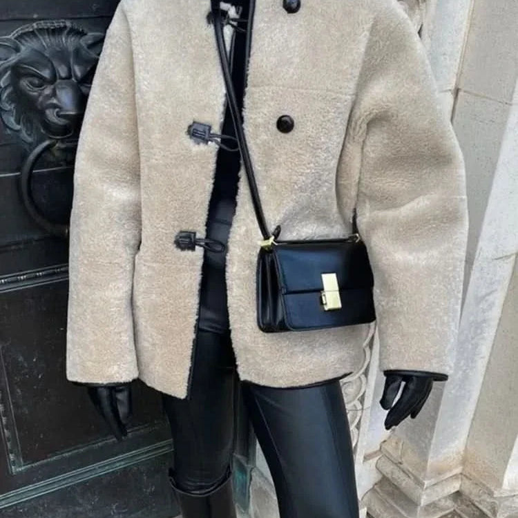 Női báránybőr kabát – Laza szabású – Széles gallér – Elöl gombos záródás