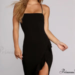 Dobd fel az alakod ezzel a lenyűgöző fodros ruhával! Ujjatlan, szögletes nyakkivágással, finom pántokkal és midi hosszával rendelkezik, amelyet aszimmetrikus fodros szegély díszít. Rugalmas krepp anyagból készült, gyönyörűen esik.