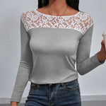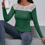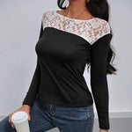 Női hosszú ujjú póló – Testhezálló szabású – Virágmintás csipke – Elegáns kerek nyakú
