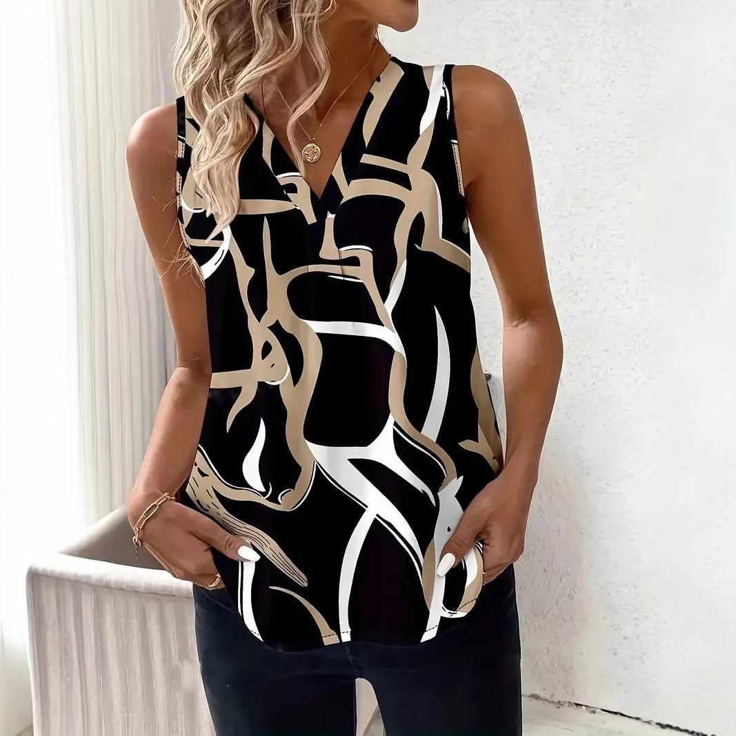Női ujjatlan felső – Laza szabású – V-nyakú – Absztrakt minta – Könnyű anyag