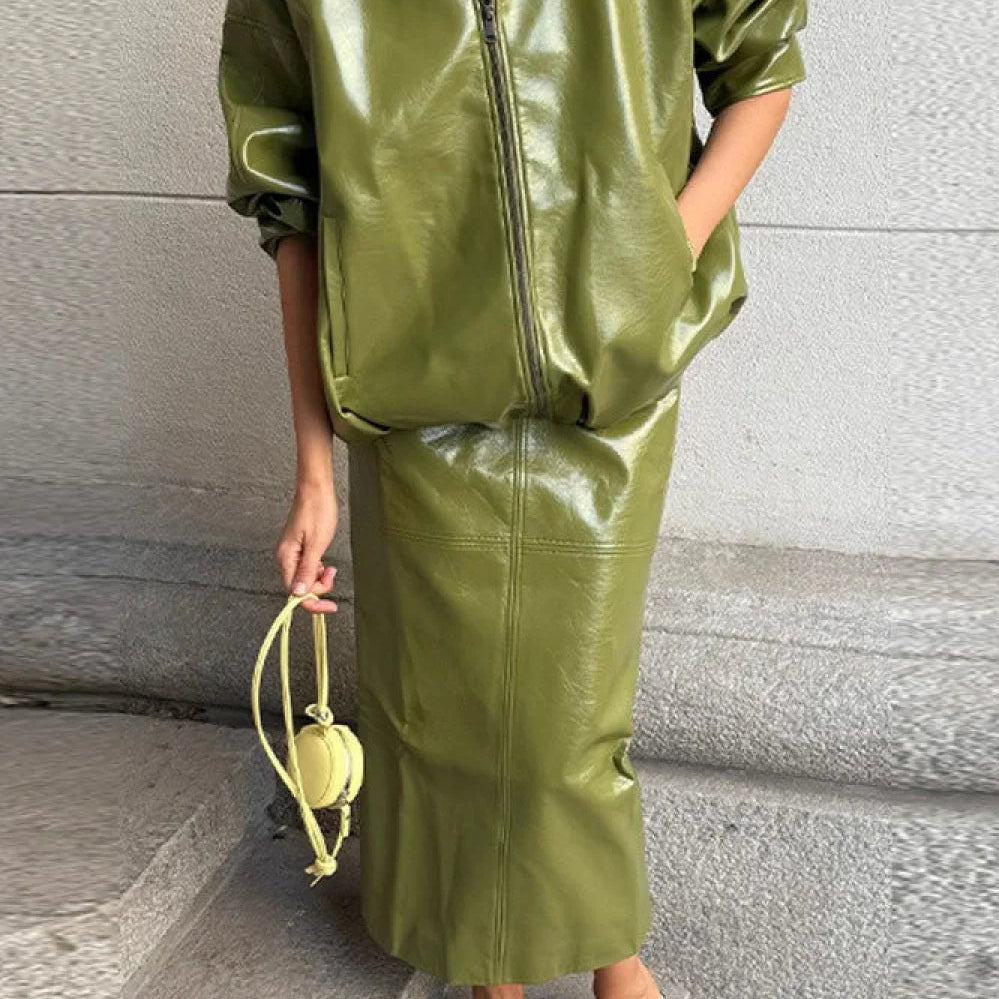 Elegáns, kétrészes szett: sima lakkbőr kabát és szoknya állógallérral