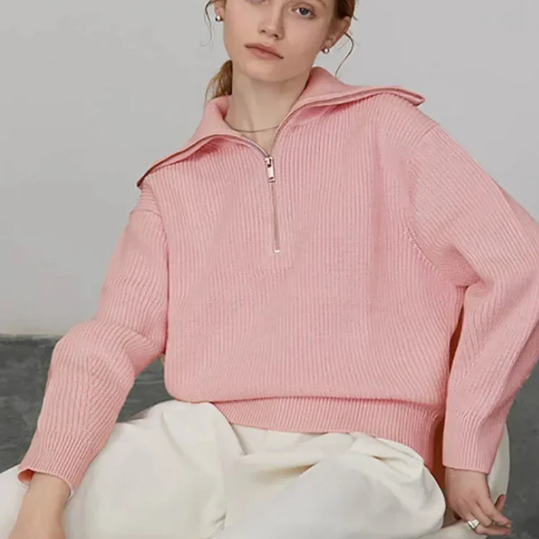 Túlméretezett női pulóver – Magas cipzáras nyakkivágás – Puha pamut – Laza szabású