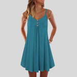 A kontrasztos gombok hármasa vonzza a tekintetet, kiemeli a ráncolt részleteket, és fokozza a ruha összképét. Puha, lélegző anyagból készült, amely optimális kényelmet biztosít, függetlenül attól, hogy mennyire meleg van. Akár kedvenc szandáljaiddal viseled egy tengerparti sétához, akár egy pár sikkes éksarkúval emeled ki a hangulatot egy naplementés vacsorához, ez a sokoldalú lenge ruha könnyed választás bármilyen nyári alkalomra.