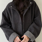 Gyapjúkabát állógallérral és kockás panelekkel, rövid mandzsettával