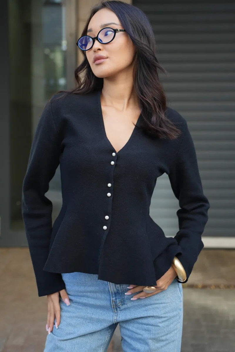 Hosszú ujjú kötött mellény testhezálló szabással és fodros szegéllyel