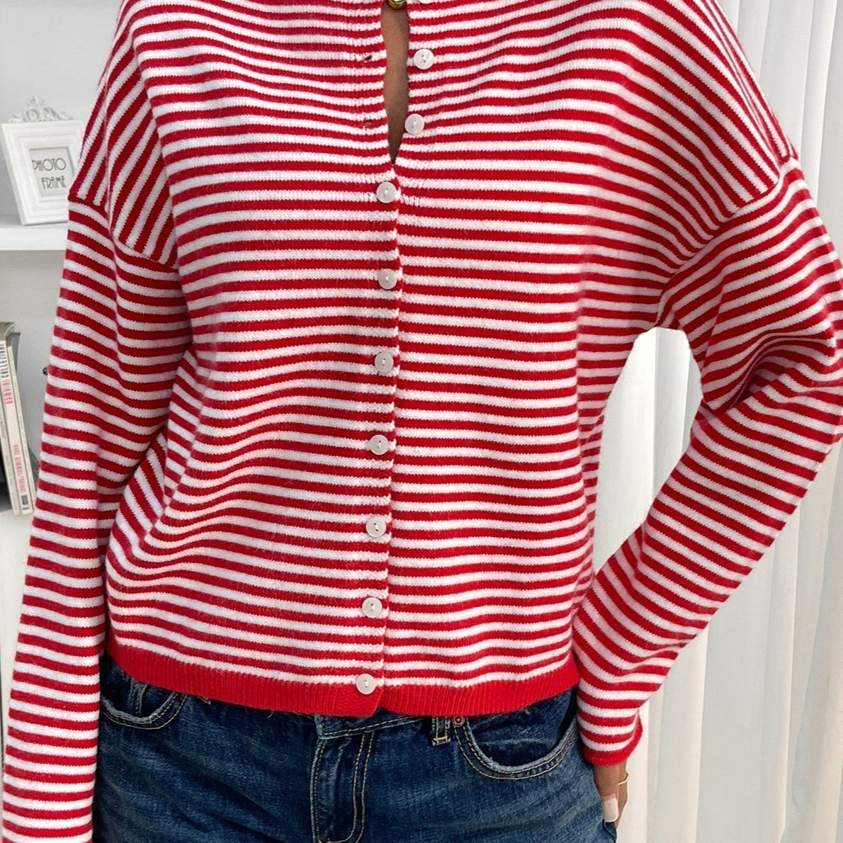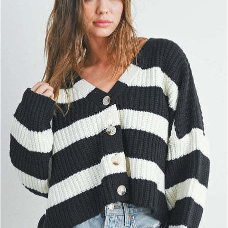 Csíkos, rövidített kardigán kerek nyakkal