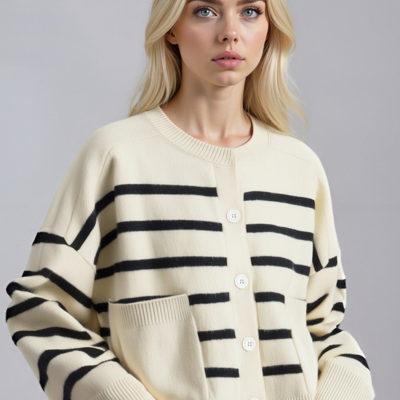 Csíkos kötött kardigán kerek nyakkal és gombos zsebbel