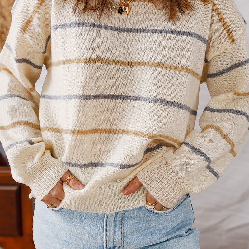 Csíkos kötött mellény széles V-nyakkal és hosszú ujjakkal