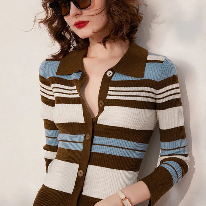 Csíkos kötött mellény lehajtott gallérral