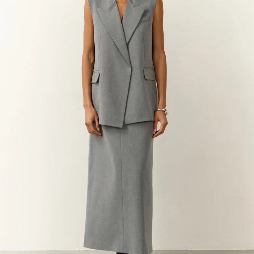 Kétrészes, szürke, bő szabású, ujjatlan, hosszú szett irodába