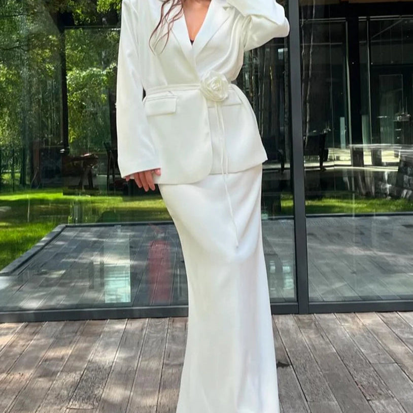 Kétrészes szett: hosszú, fehér szatén szoknya, hosszú ujjakkal, irodai viseletre