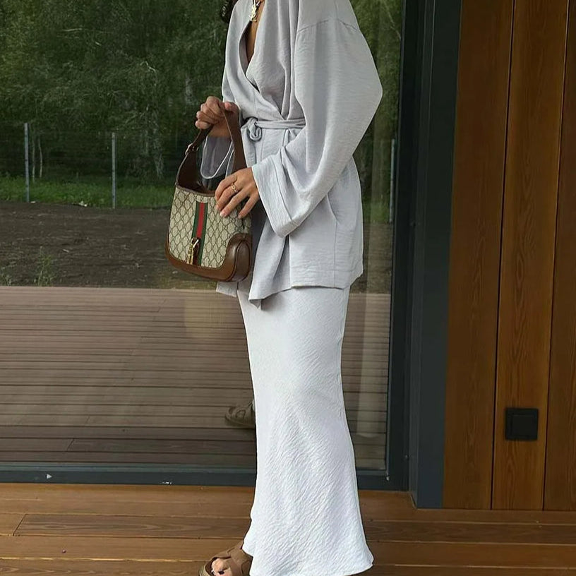 Kétrészes szett: szürke szoknya fűzős részletekkel és bokáig érő szegéllyel az irodába