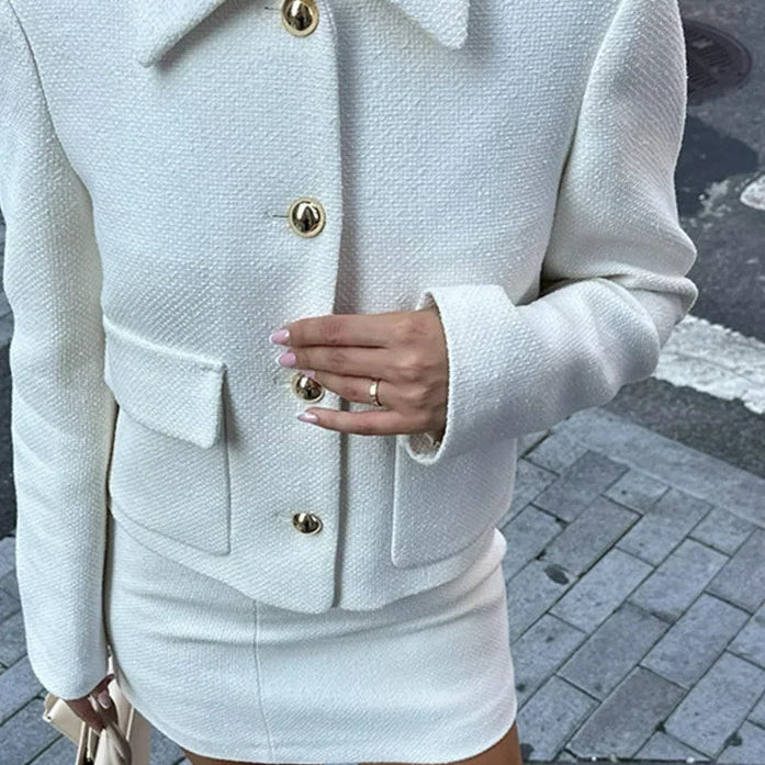 Kétrészes szett: sima kabát és rövid miniszoknya az irodába