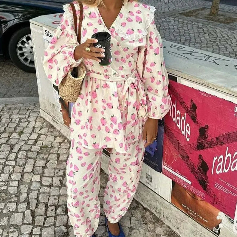Kétrészes szett: rózsaszín mintás, felhajtható irodai nadrág