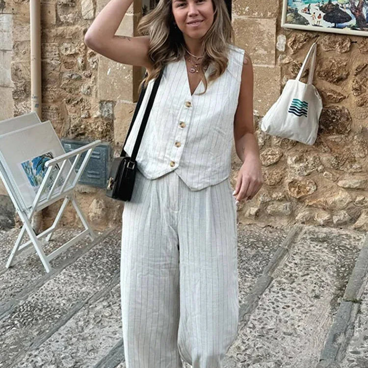Kétrészes irodai szett: fehér mintás, V-nyakú, ujjatlan nadrág