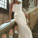 Hosszú, testhezálló, pánt nélküli és csontos vintage csipkeruha.