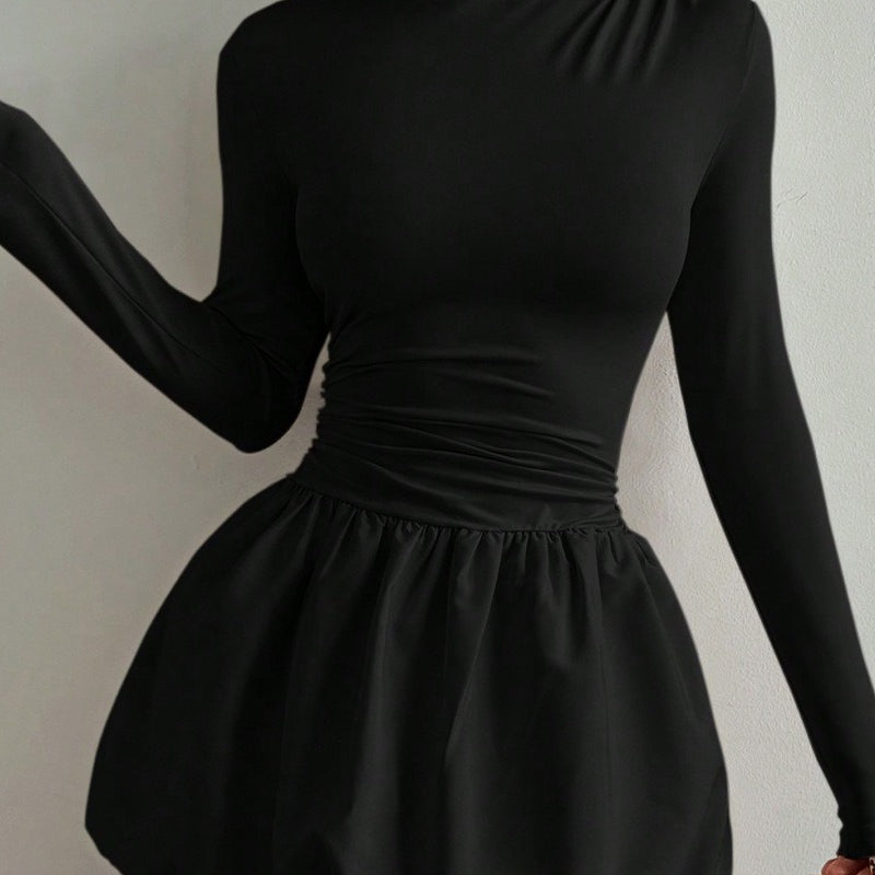 Elegáns, testhezálló, rugalmas miniruha hosszú ujjakkal és fodros díszítéssel