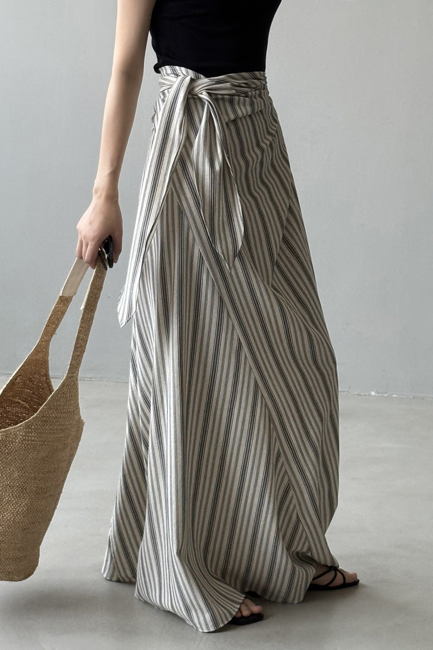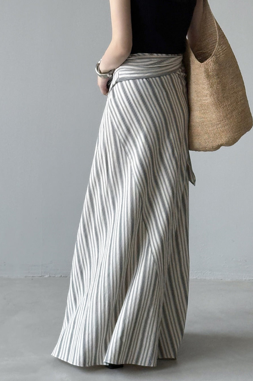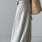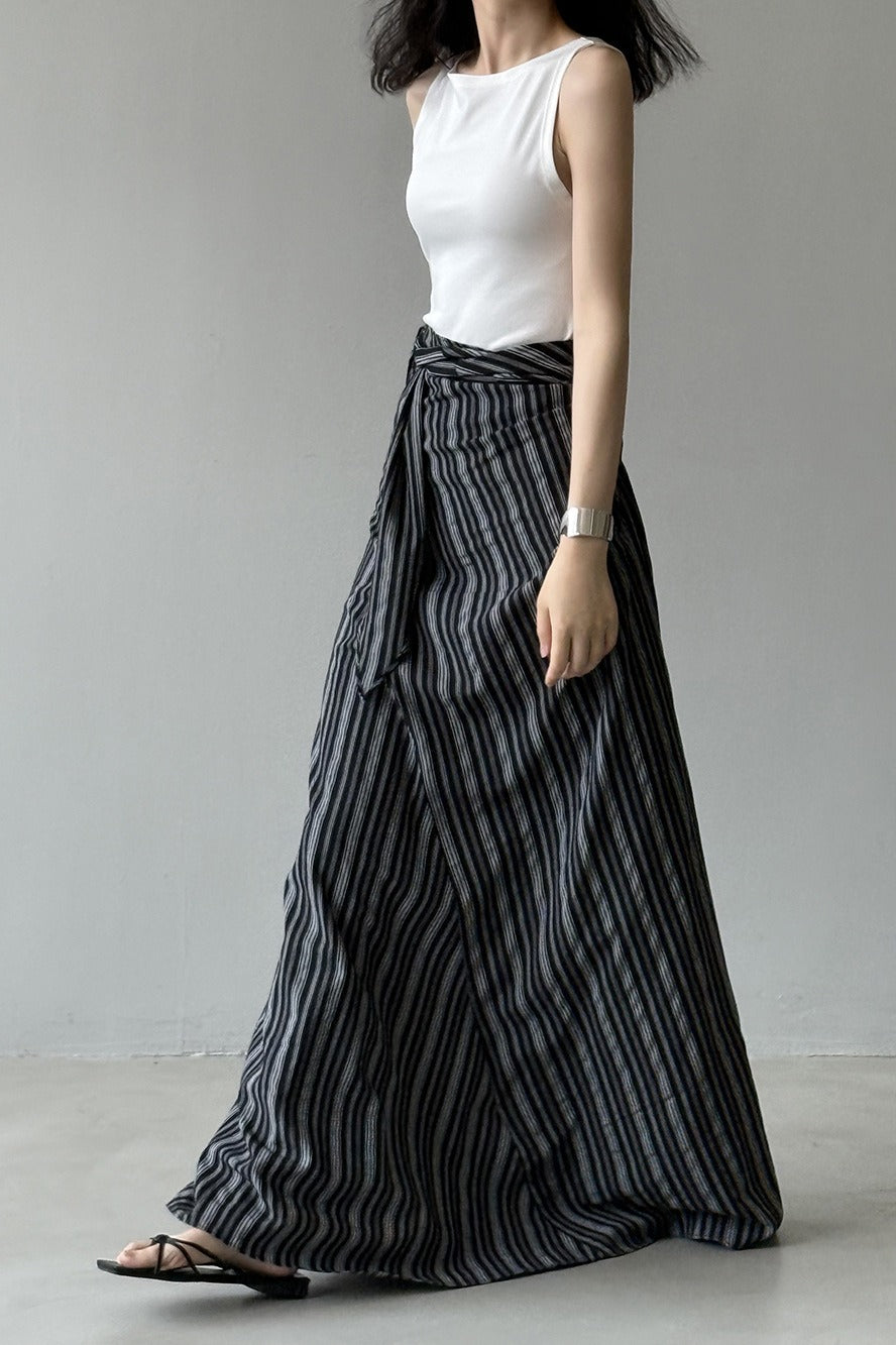 Hosszú, csíkos, magas derekú A-vonalú szoknya megkötővel