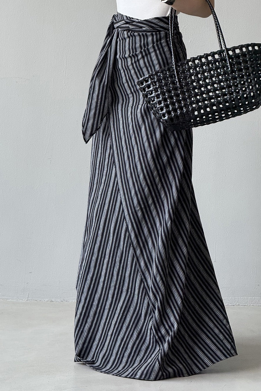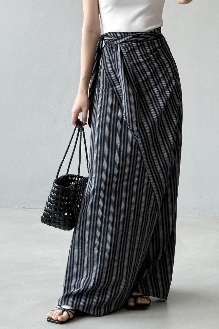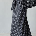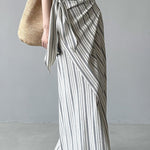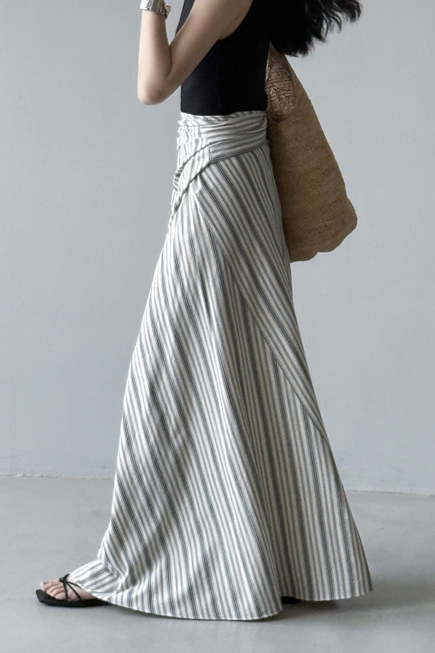 Hosszú, csíkos, magas derekú A-vonalú szoknya megkötővel