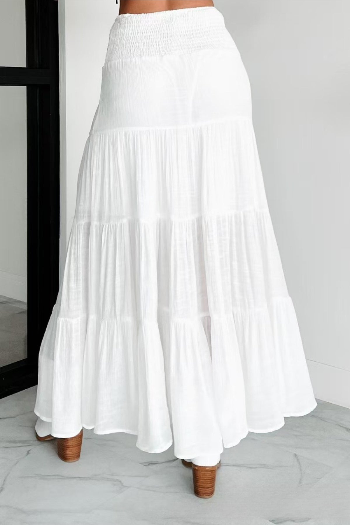 Hosszú, magas derekú A-vonalú szoknya kontrasztos húzózsinórral, bohém sikkes stílus